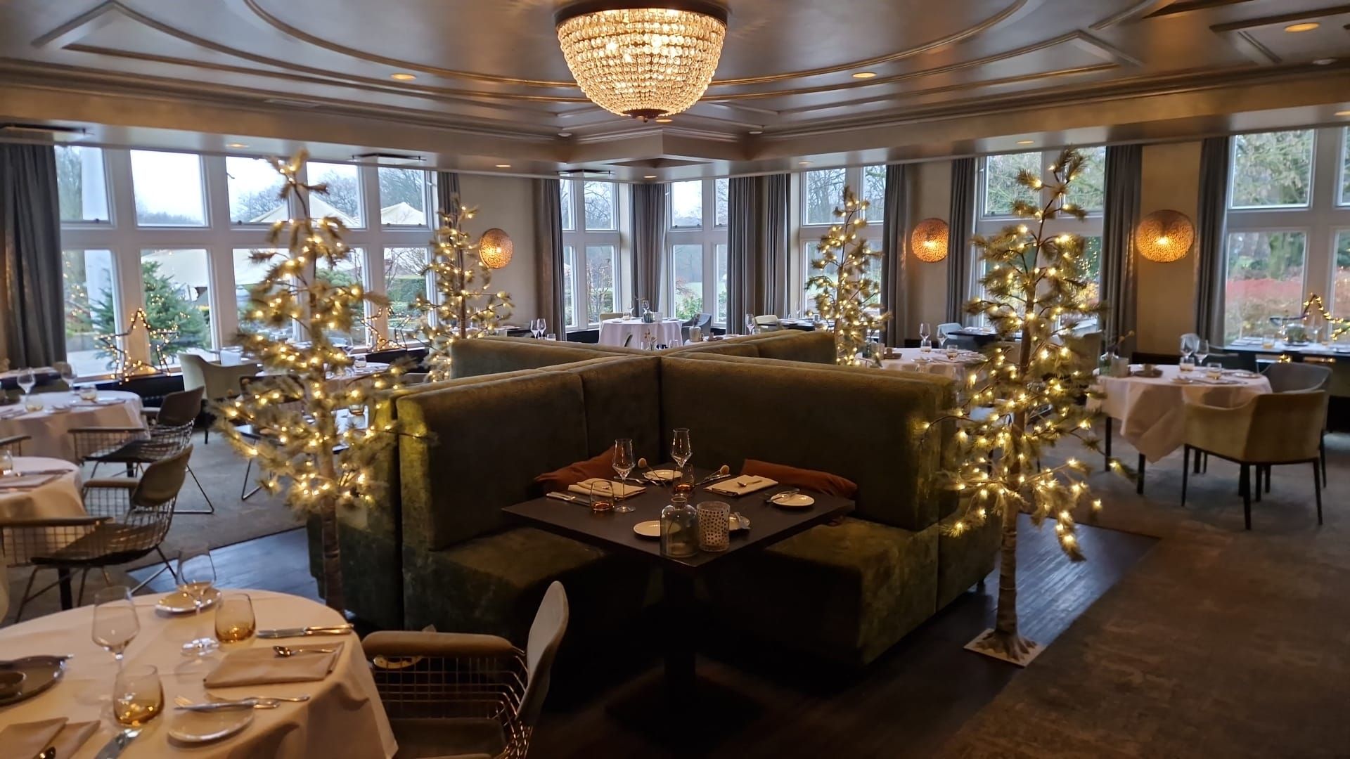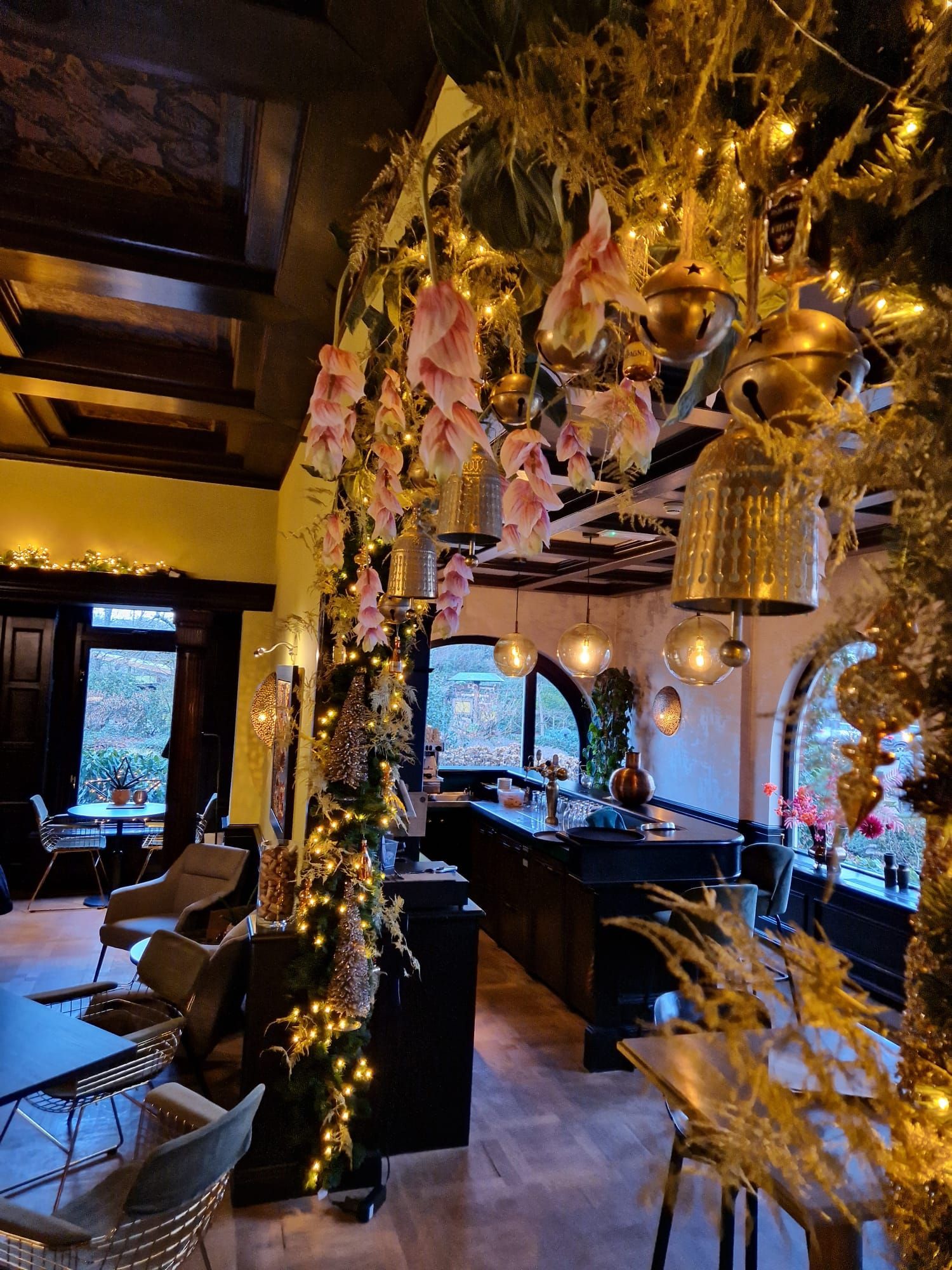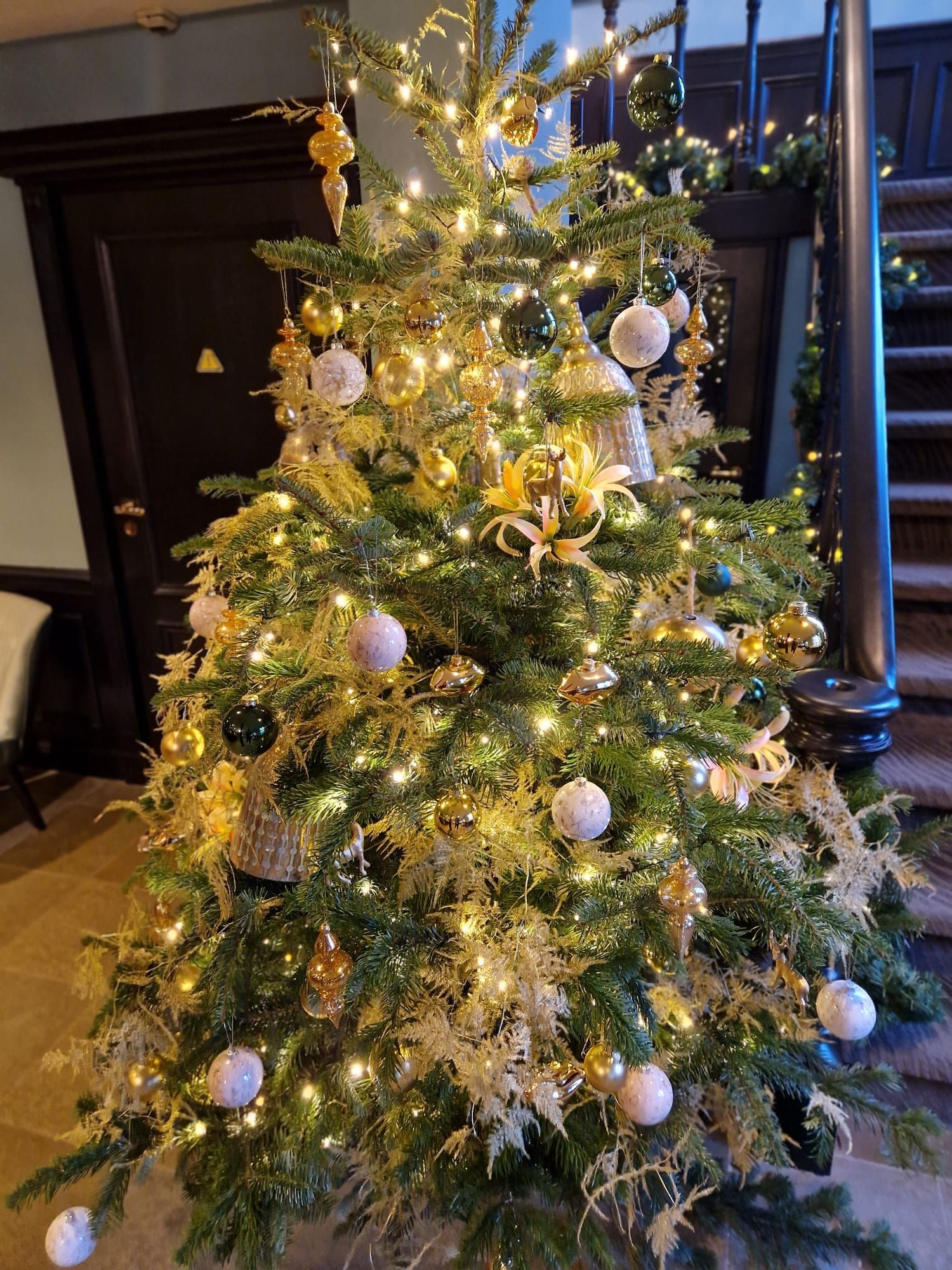 We ontvingen een verzoek van Landgoed de Wilmersberg om in elke ruimte een opvallende eyecatcher te creëren: in de lounge een adembenemende boog, in de lobby een majestueuze kerstboom versierd met diverse luxe ballen, en in het restaurant een kalme sfeer te bewerkstelligen. Ook de receptiebalie kon worden aangekleed in winterse stijlen.